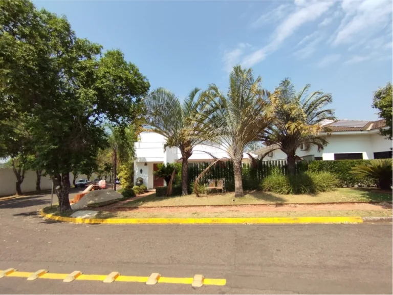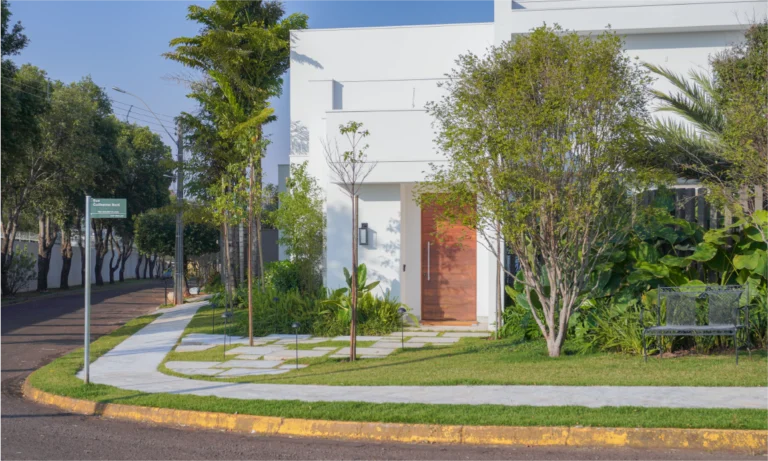 Destaque do Projeto: Focamos em uma volumetria rica, utilizando palmeiras imponentes e forrações densas que emolduram a fachada.